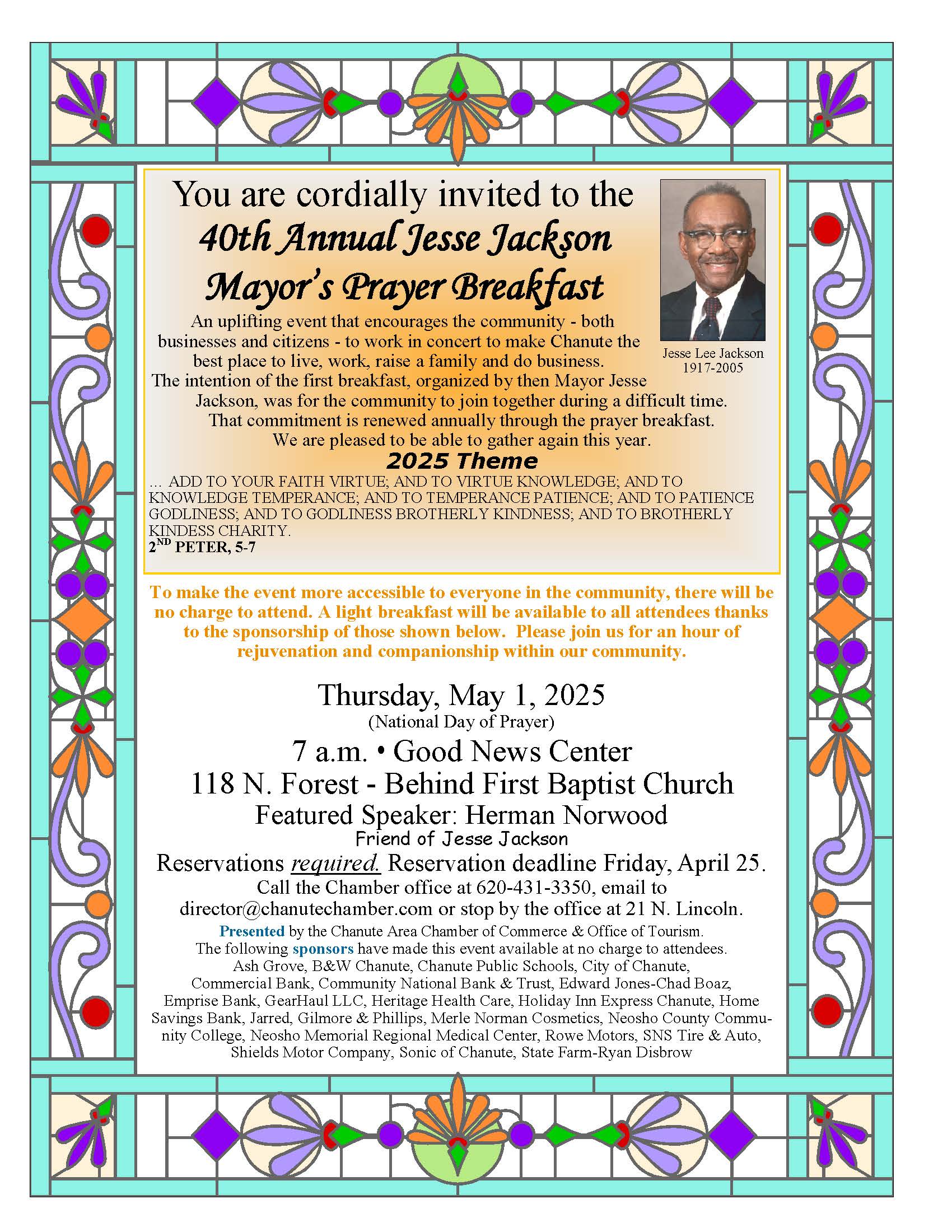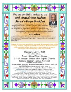 40th Annual Jesse Jackson Mayor’s Prayer Breakfast- 7 a.m. • Good News Center -118 N. Forest – Behind First Baptist Church Featured Speaker: Herman Norwood; Reservations required. Reservation deadline Friday, April 25