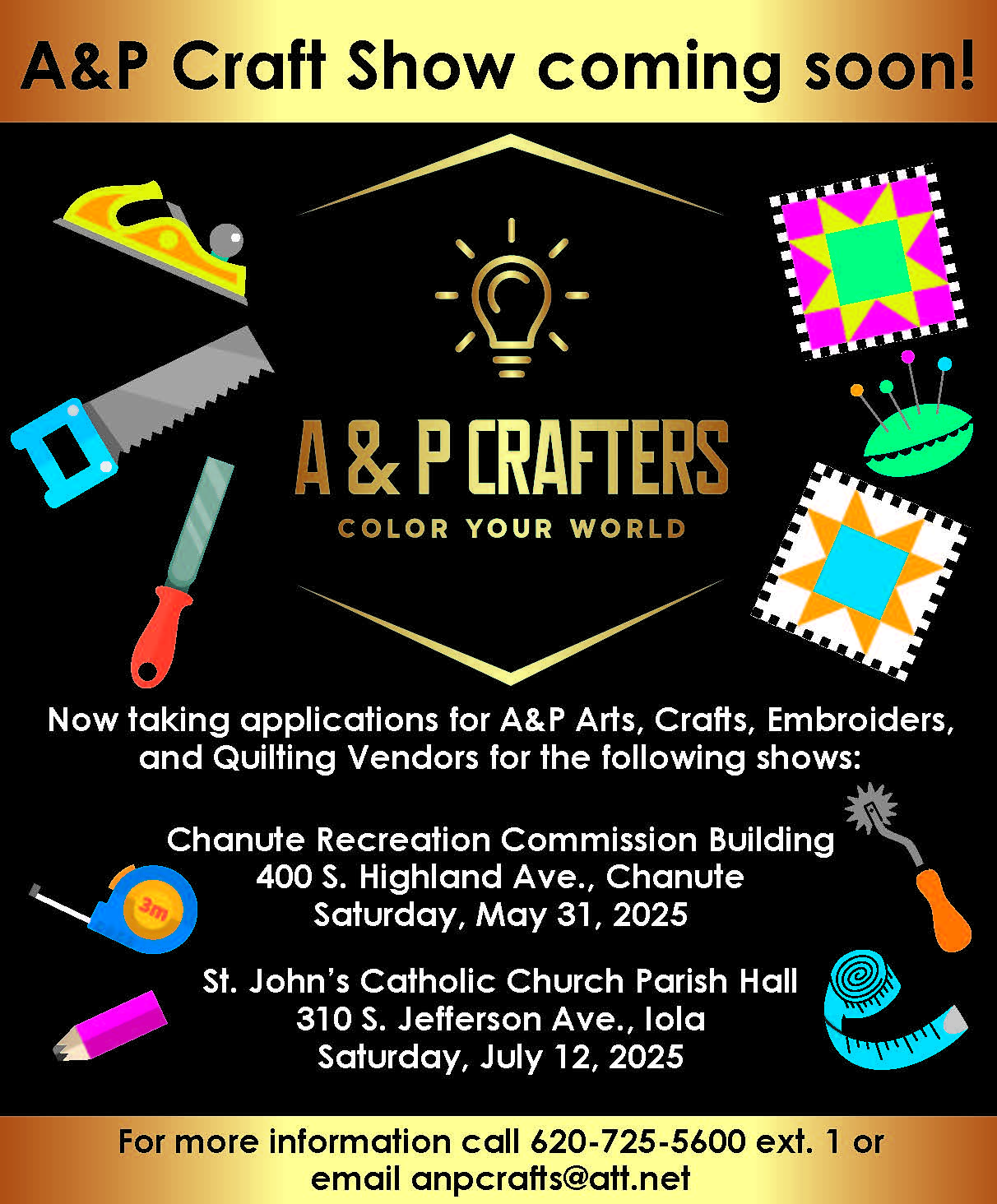 A & P Craft Show Coming Soon! Now taking applications for A&P Arts, Crafts, Embroiders, and Quilting Vendors at Chanute Recreation Commission Building- Sat. May 31, 2025