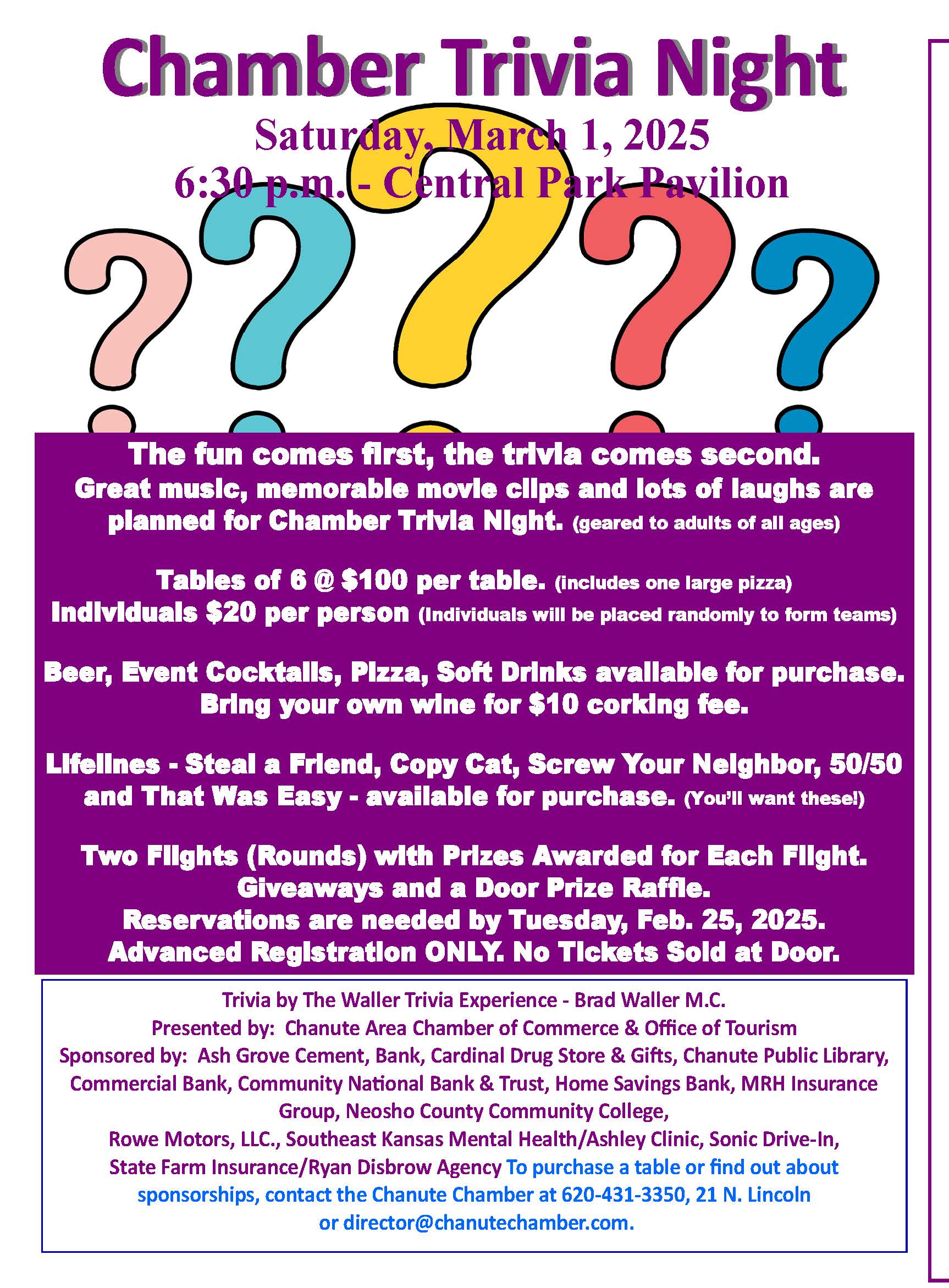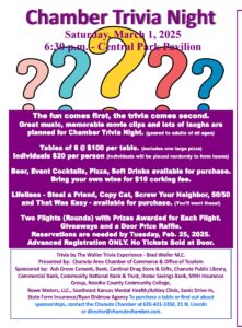 Chamber Trivia Night – Central Park Pavilion; Great Music, memorable movie clips, and lots of laughs! Reservations are needed by Tues. Feb. 25, 2025