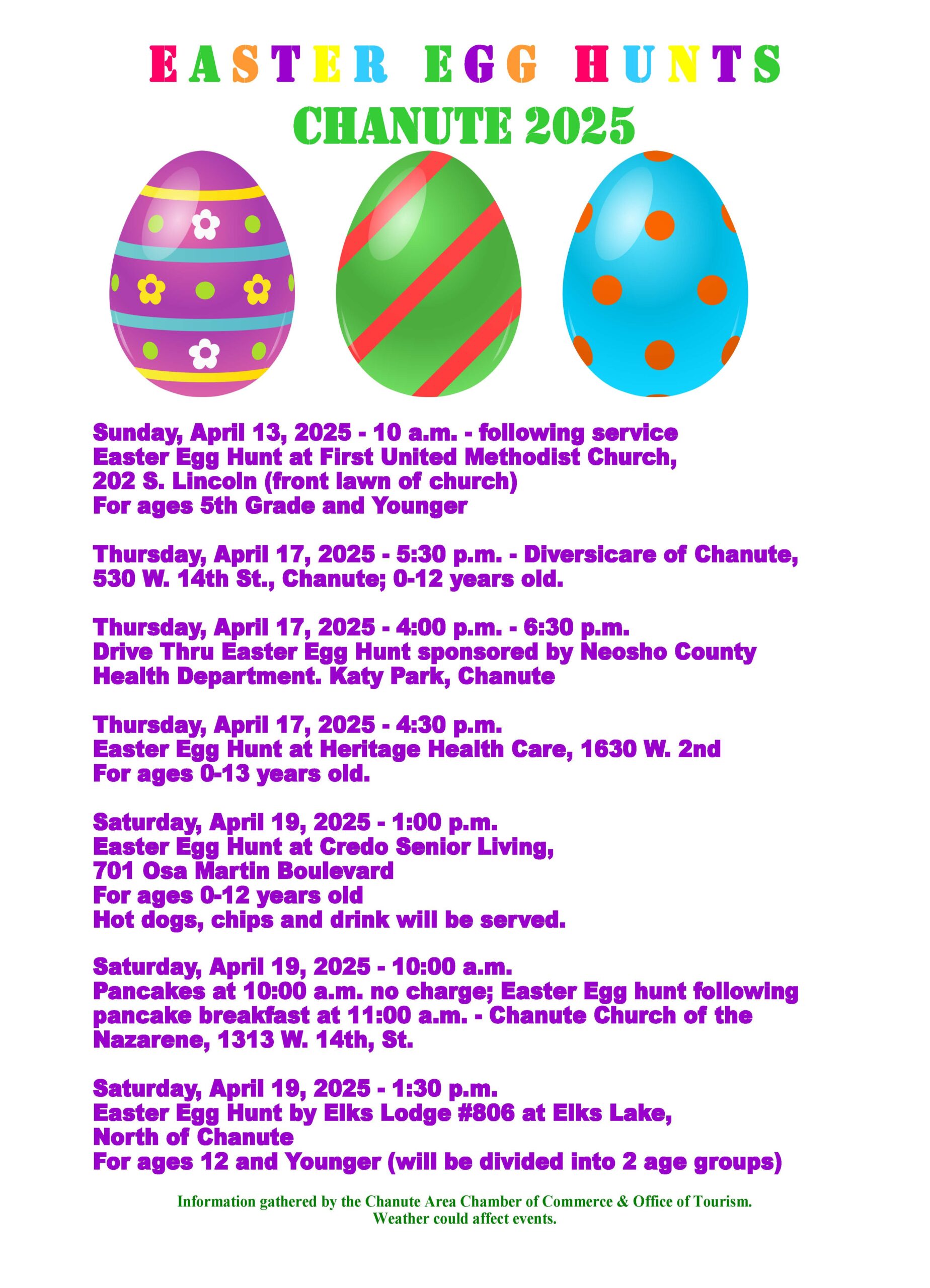 Chanute Easter Egg Hunts – April 13-19 at various locations- See flyer for details