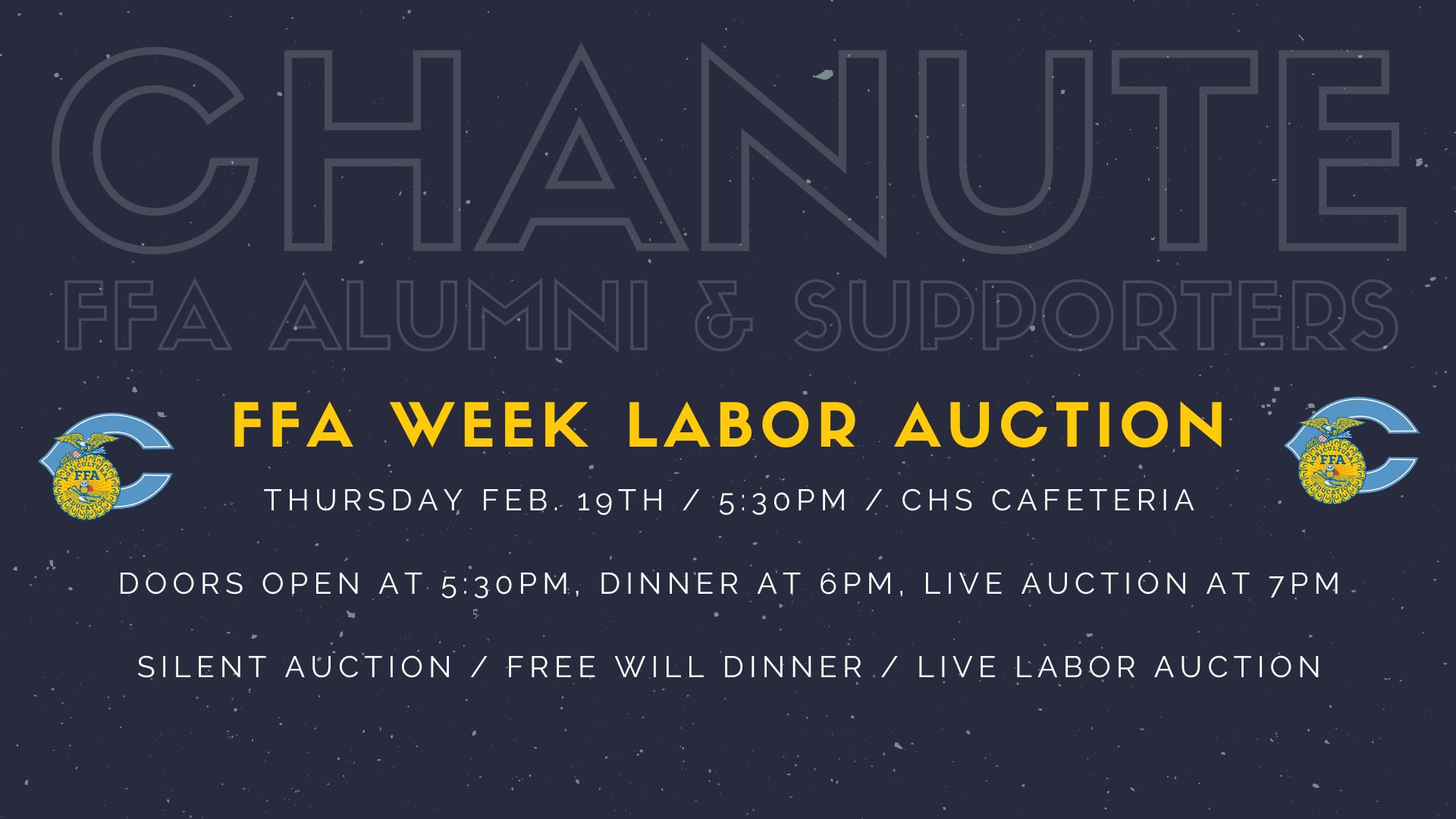 Join us for our 2nd Annual Chanute FFA Alumni & Supporters Labor Auction! The Chanute FFA Alumni & Supporters Chapter was chartered in the Fall of 2024 and their mission is to support the Chanute FFA Chapter. This auction will benefit students through our senior scholarship program and to support activities and opportunities for members of the Chanute FFA. The auction will take place Thursday, February 19th to help kick off our National FFA Week celebrations. There will be a silent auction, which will include projects fabricated by Chanute FFA members and items donated by local businesses. The main event of the night is the live labor auction. Students will donate their time to be auctioned off to help you with projects you need done on your farm/ranch, at home, or at your business. Dinner will be included an more details will be shared as we get closer to the event. We hope to see you there!