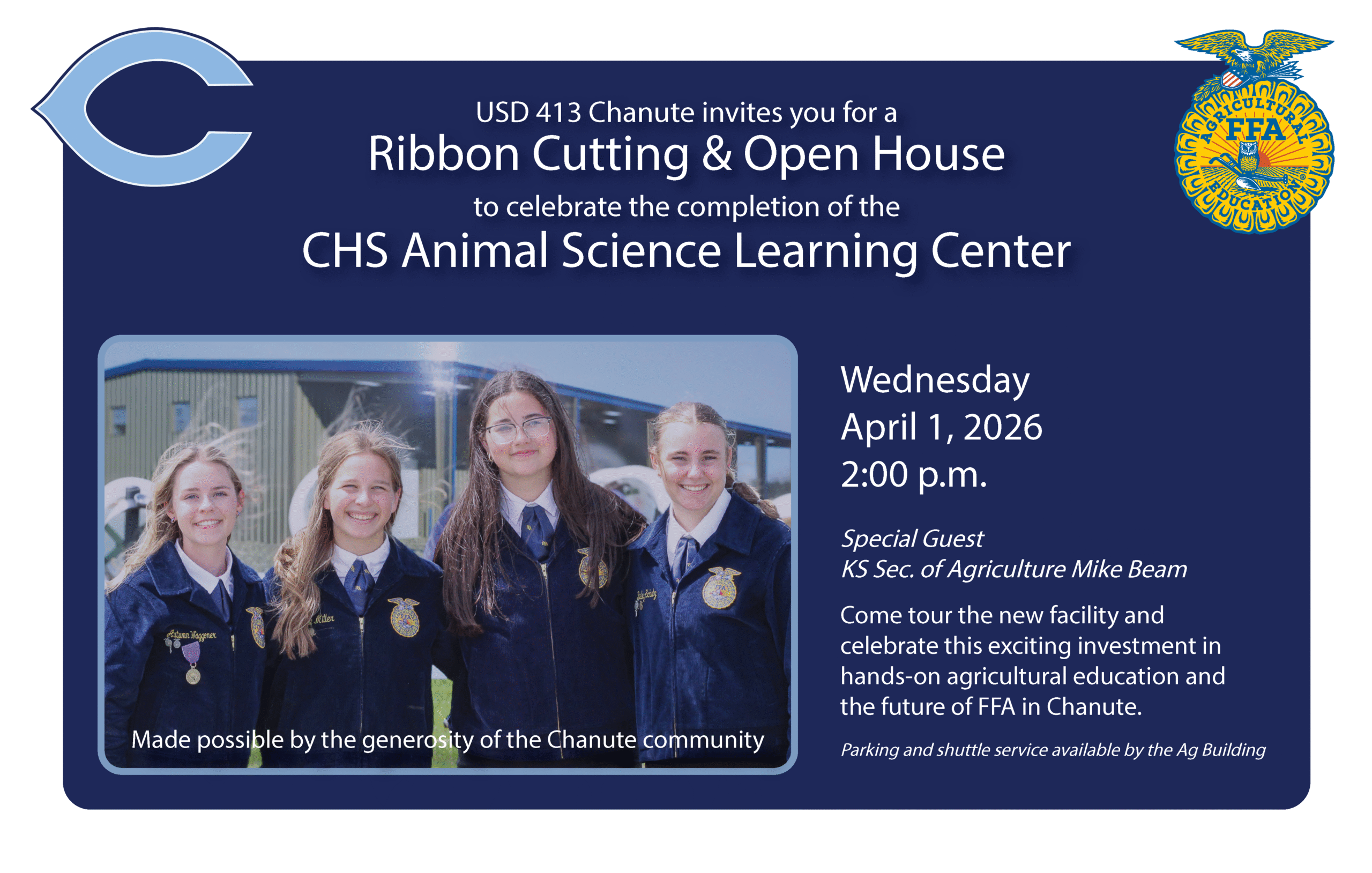 Chanute High School Animal Science Learning Center Ribbon Cutting- Wed. April 1, 2026