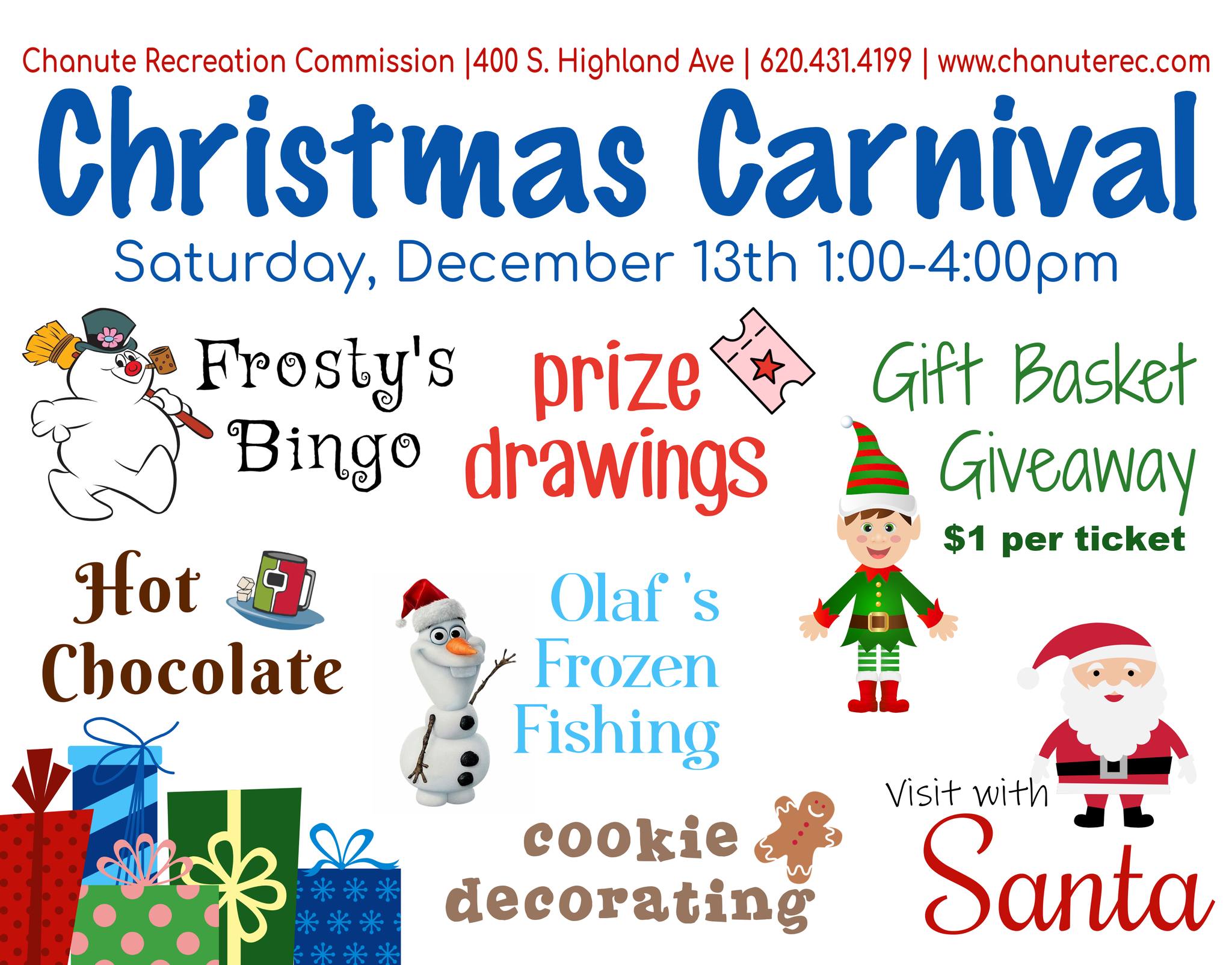 Chanute Recreation Commission will host a Christmas Carnival on Saturday, Dec. 13; 1-4:00 p.m.