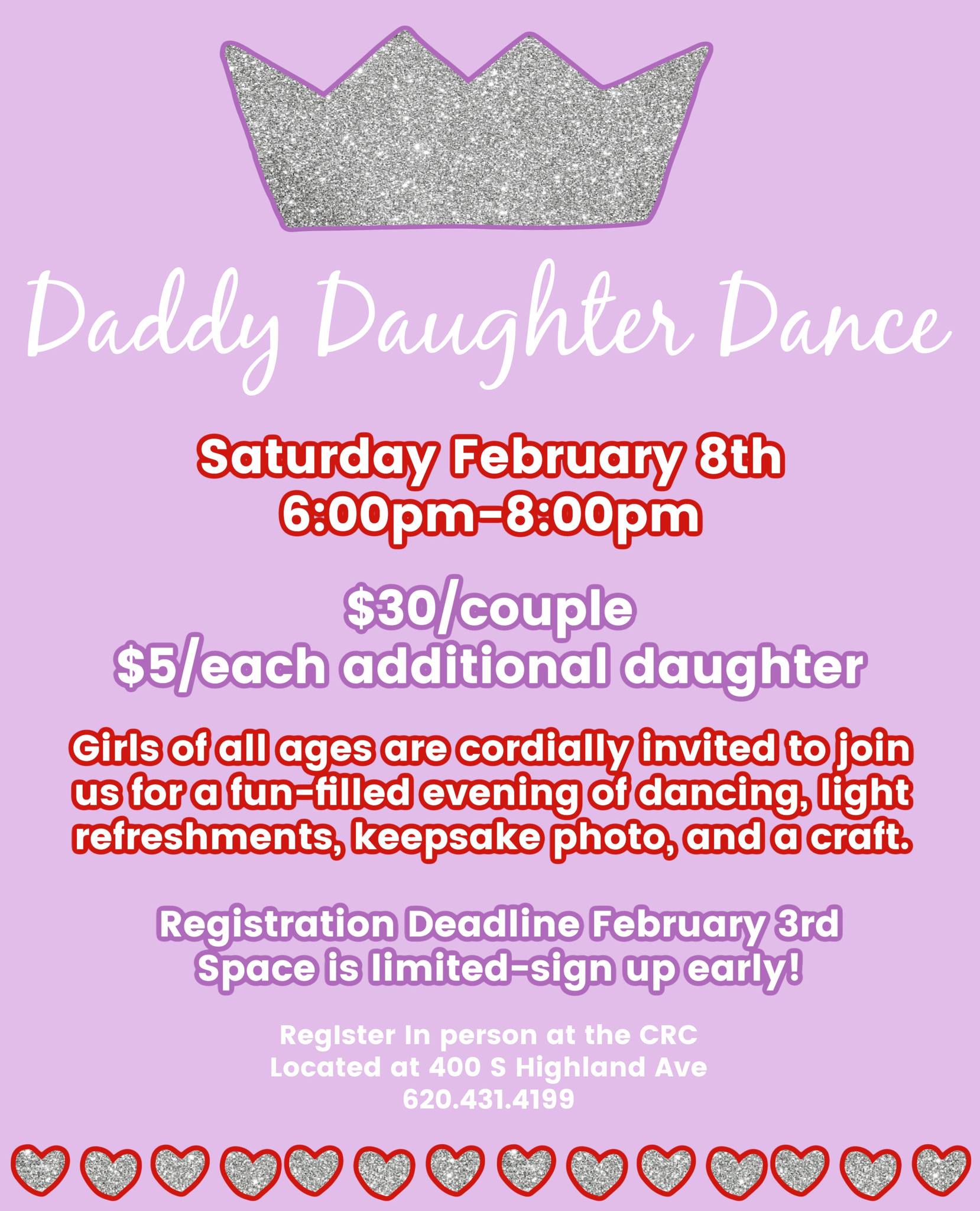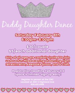 Chanute Recreation Daddy Daughter Dance – $30/Couple, Registration Deadline Feb. 3rd at 400 S. Highland
