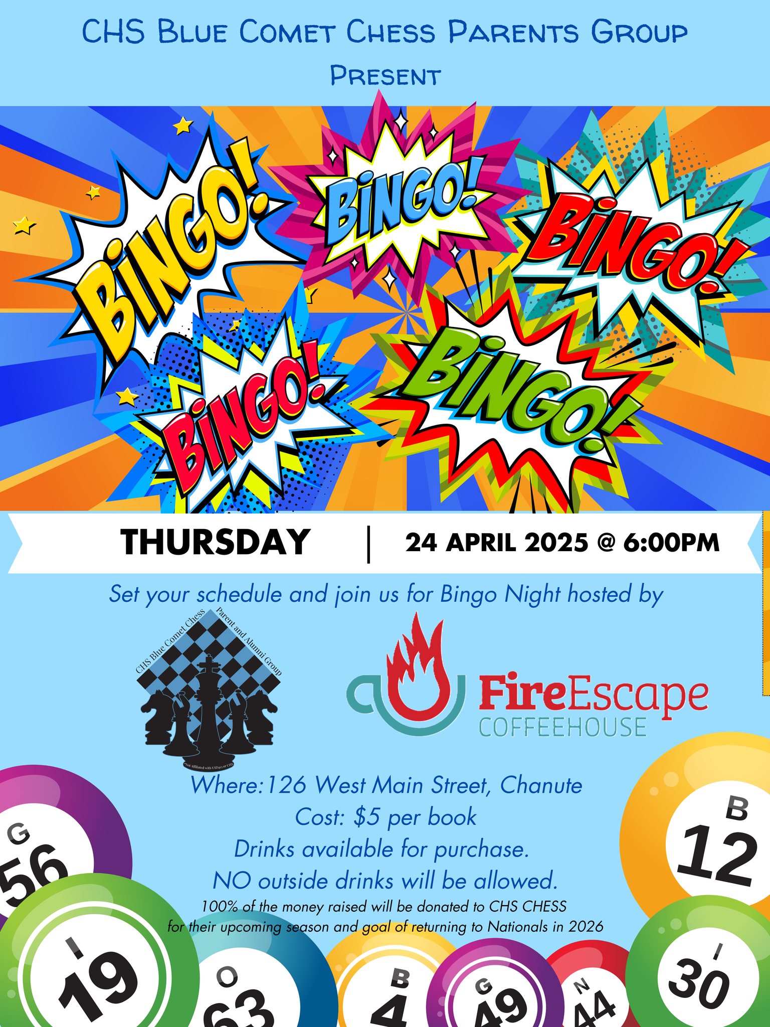 CHS Blue Comet Chess Parents Group Present – Bingo Night at FireEscape Coffee House, Thurs. Apr. 24 @ 6:00 p.m.
