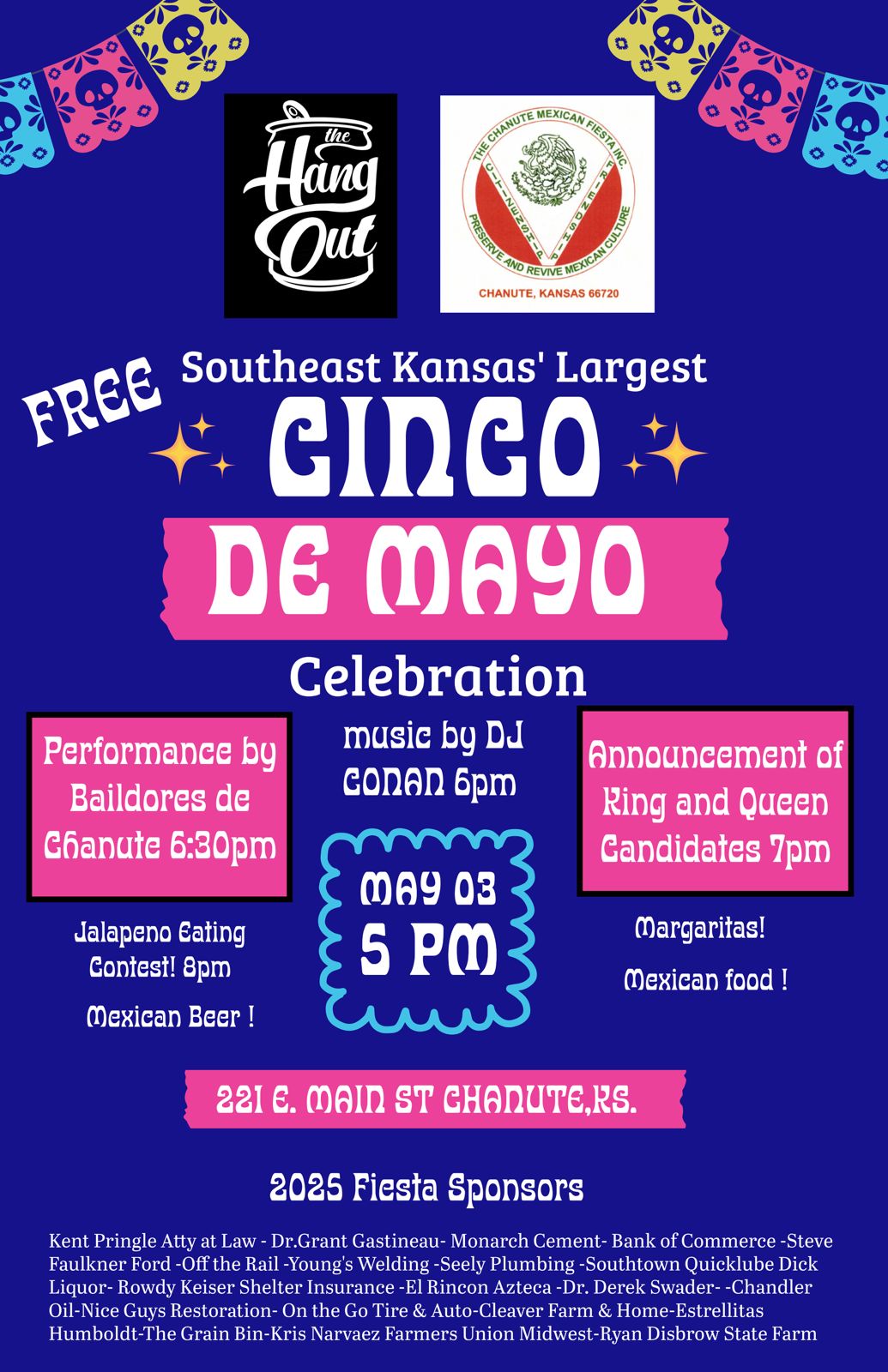 Cinco De Mayo Celebration – The Hang Out will be providing food and beverages. DJ starting at 6, dance group at 6:30, and introduction to our 2025 Chanute Mexican Fiesta Royalty Candidates at 7, and a Jalapeno eating contest at 8.
