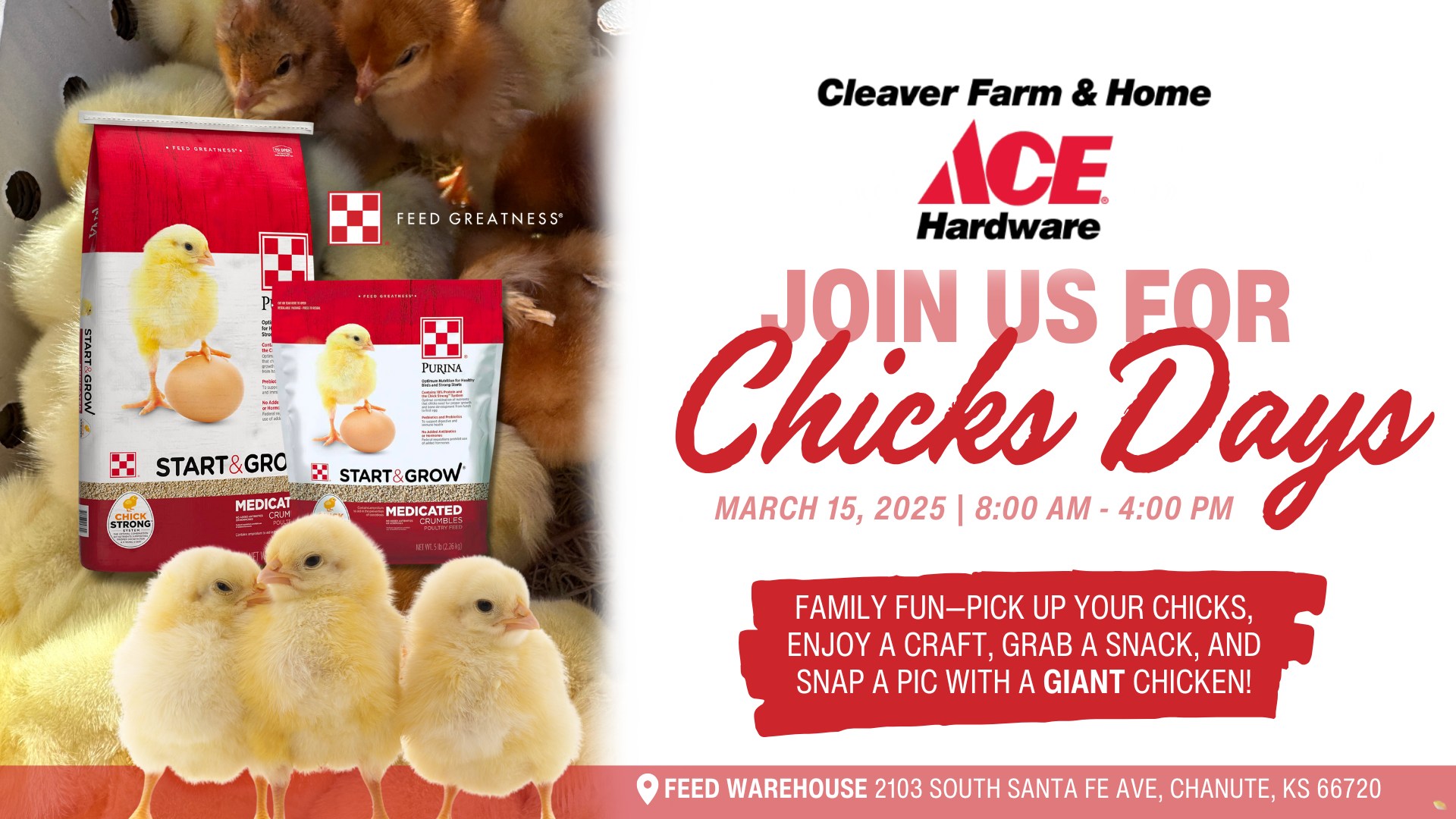 Cleaver Farm & Home ACE Chick Days – Family Fun – Pick up your chicks, Enjoy a craft, Grab a Snack. March 15, 2025