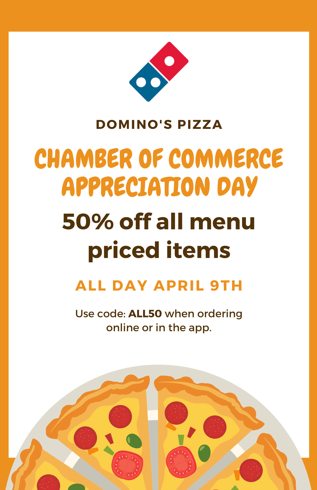 Domino’s Pizza Chamber of Commerce Appreciation Day- 50% off all menu priced items; All Day April 9th!