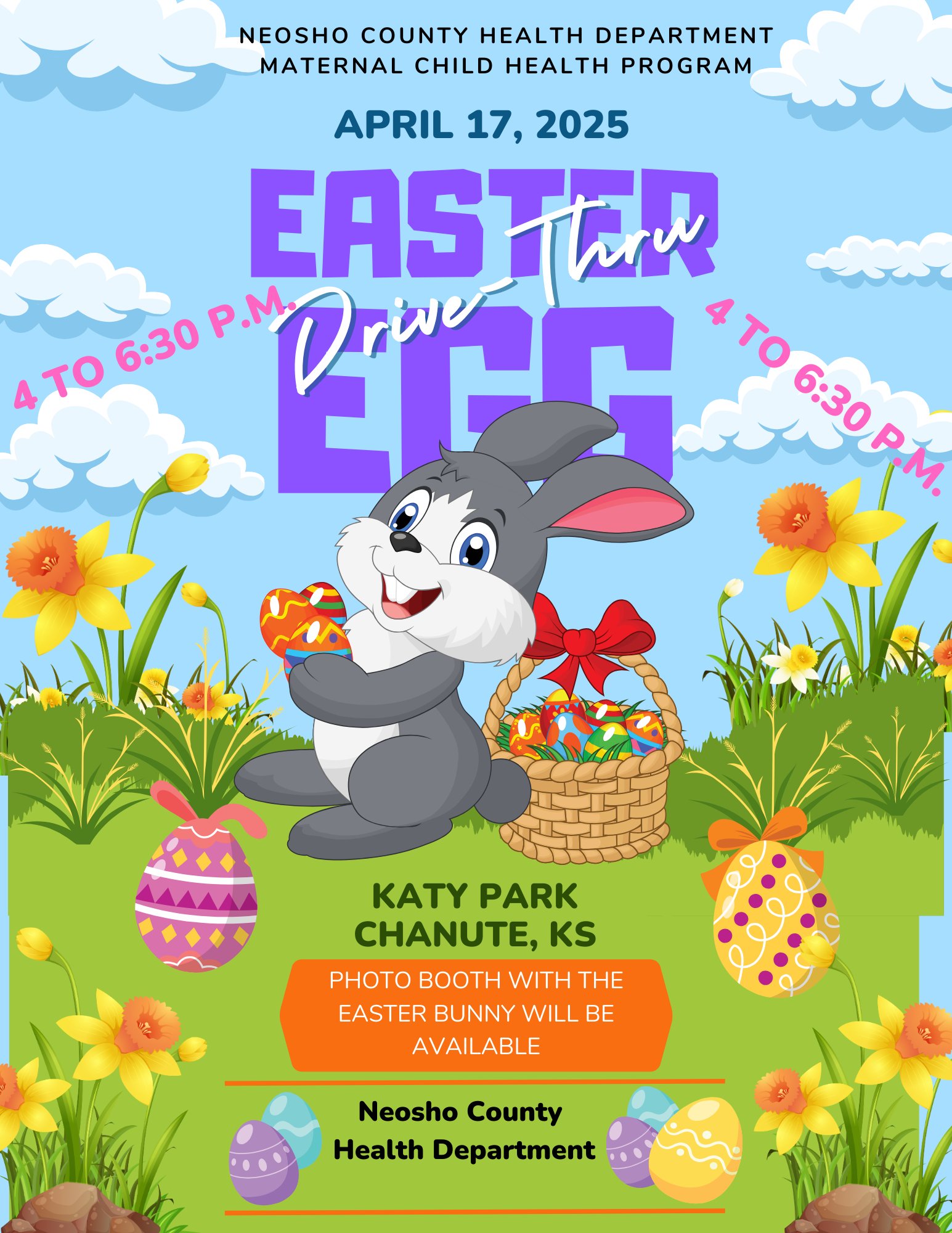 Drive Thru Easter Egg Hunt- Neosho County Health Dept.; April 17, 4-6:30 p.m.; Katy Park, Chanute
