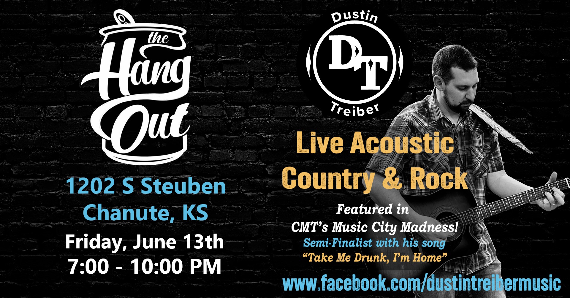 Dustin Treiber returns to perform his LIVE Solo Acoustic Country/Rock Show, at The Hangout in Chanute, KS