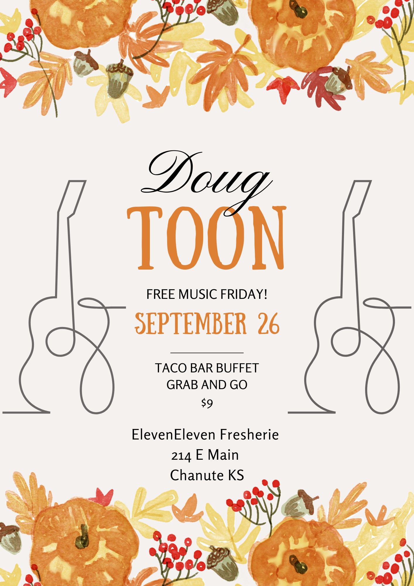 Eleveneleven Fresherie will be welcoming the Artist’s Alley crowd on FRIDAY the 26th! Free Music from Doug and some delicious tacos by Jessica!