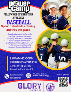 FCA Power Camp; Baseball- Open to students entering 3rd – 8th grade. June 11th, 2025. Riverside Park, Iola KS.