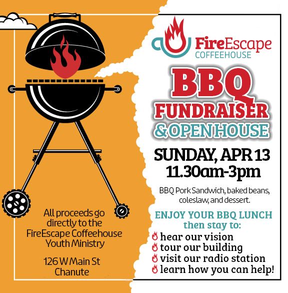 FireEscape CoffeeHouse BBQ Fundraiser & Open House – Sunday, April 13. BBQ Pork Sandwich, baked beans, coleslaw, and dessert.