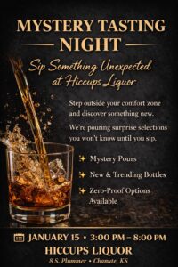 Hiccups Liquor is hosting a Mystery Tasting Night – Jan. 15, 3-8 p.m.- 8 S. Plummer, Chanute