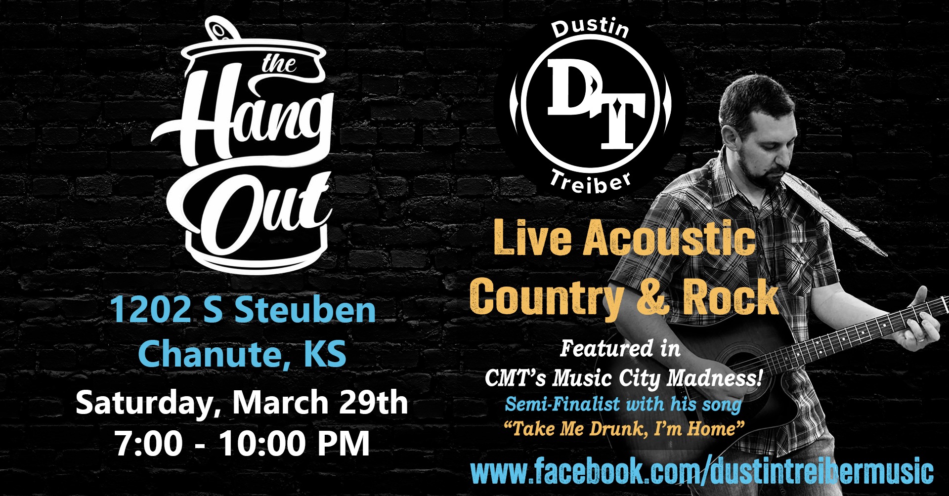 Live Acoustic Country & Rock with Dustin Treiber at The Hang Out; 1202 S. Steuben- Featured in CMT’s Music City Madness Semi-Finalist