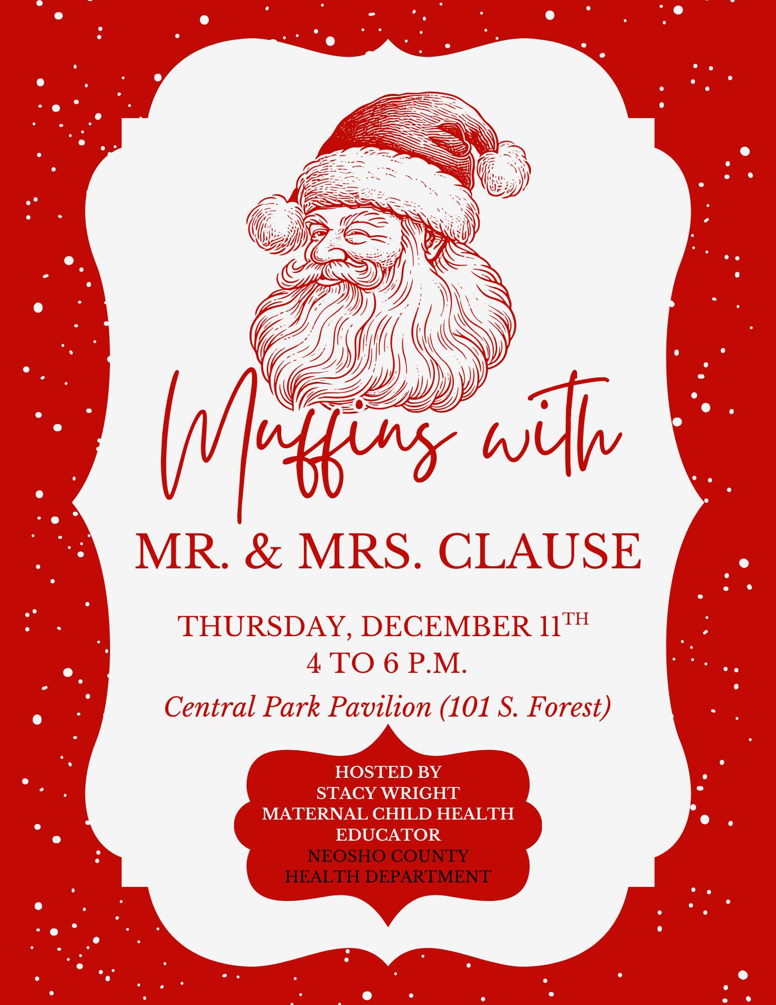 Muffins with Mr & Mrs Clause – Thur., Dec. 11; 4-6 p.m. Central Park Pavilion (101 S. Forest) Hosted by Neosho County Health Department