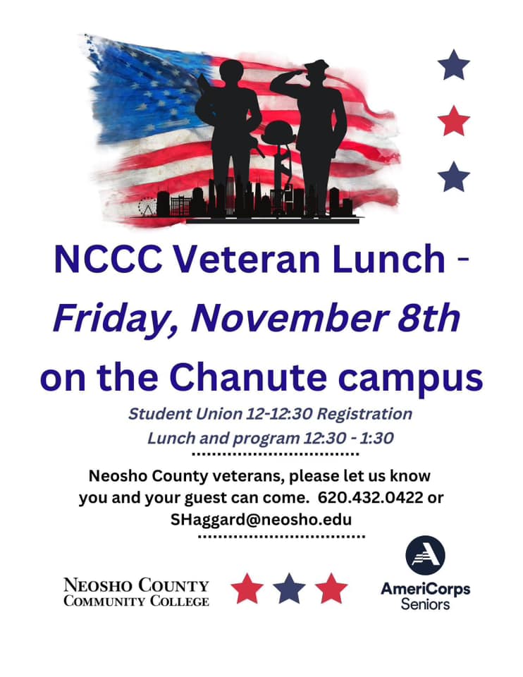 NCCC Veteran Lunch, on the Chanute Campus Friday Nov. 8th – Please RSVP 620.432.0422