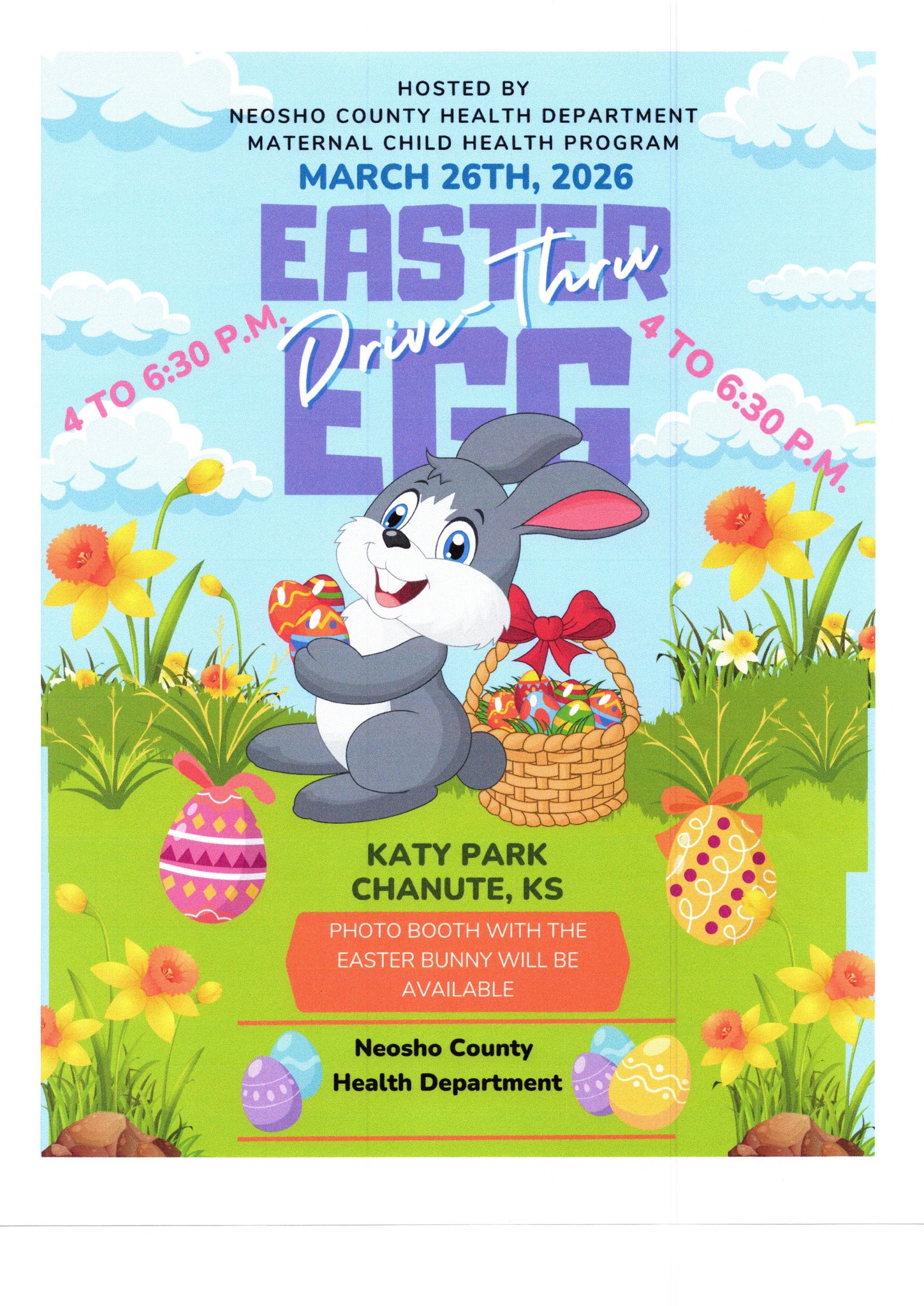 Neosho County Health Department Easter Egg Drive Thru! March 26th, 4-6:30 at Katy Park. Hosted by our Maternal Child Health Program