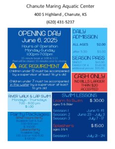 Opening Day for Chanute Aquatic Center; June 6, 2025 – 400 S Highland , Chanute, KS