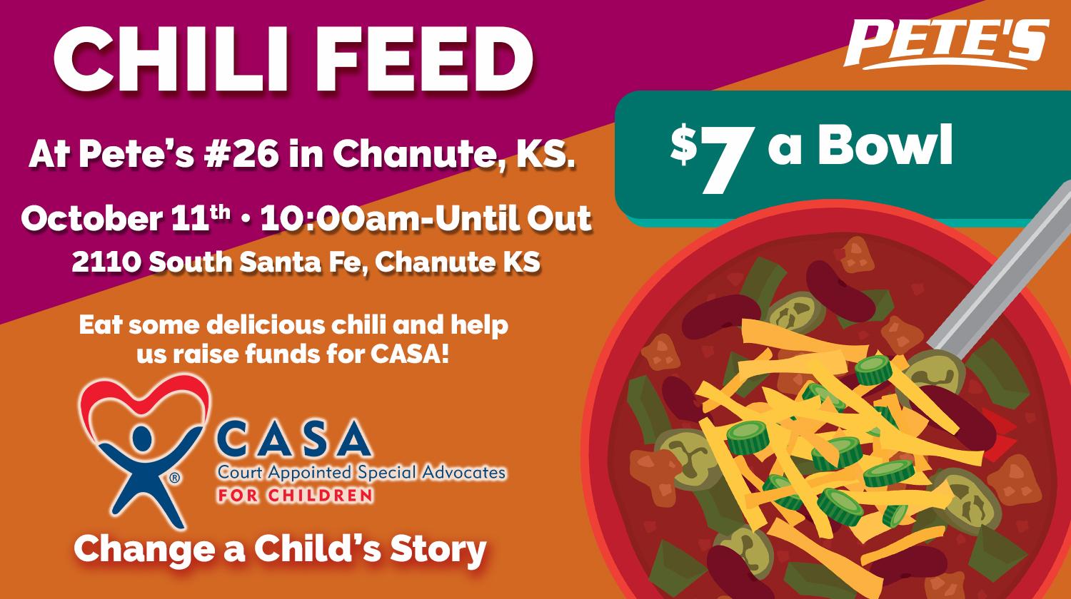 Pete’s #26 Chili Feed in Chanute, KS – Help Raise Funds for CASA $7 a Bowl