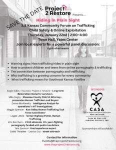 Project 2 Restore, a nationally recognized restoration home for traffick survivors, is hosting an upcoming community forum to address the critical issue of sex trafficking. Sponsored by CASA of the 31st Judicial District, this event brings together eight expert facilitators to share vital insights on protecting our children and vulnerable adults.