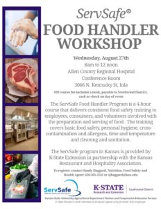 ServeSafe Food Handler Workshop – Wed., August 27, 8-12 noon; Allen County Regional Hospital- sponsored by K-State Extension
