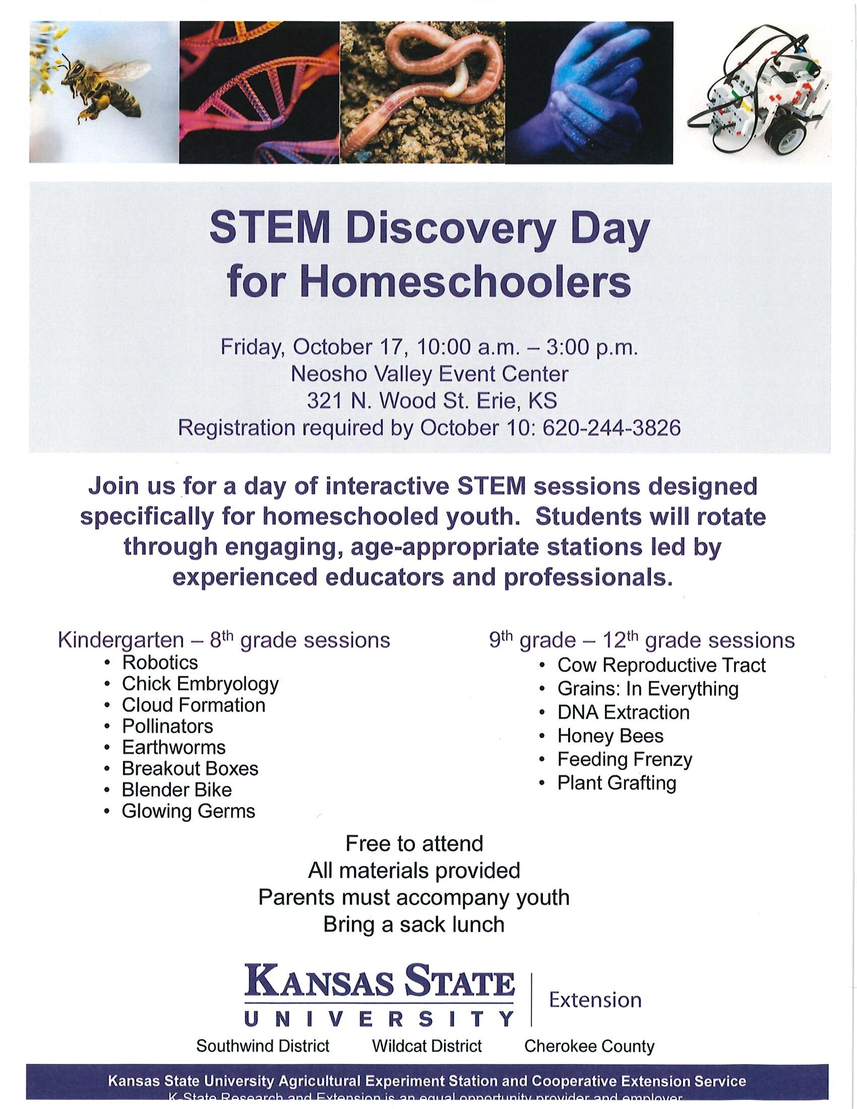 STEM Discovery Day for Homeschoolers – Friday October 17, 10:00 a.m. – 3:00 p.m.; 321 N. Wood St., Erie KS