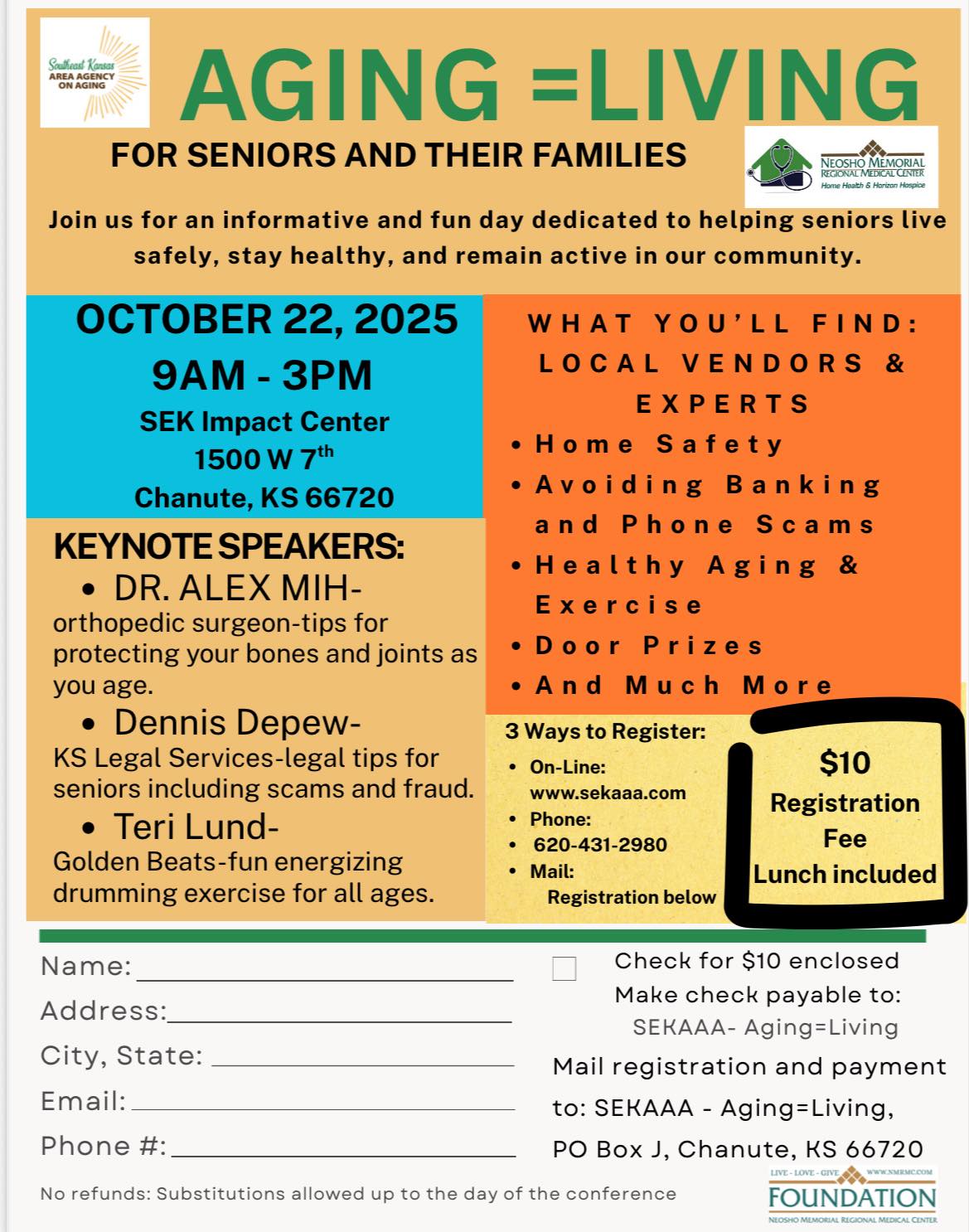 The 2nd Annual Aging=Living Conference 9 am – 3 pm at the SEK Impact Center. Registration fee $10 includes lunch. Sign up at www.sekaaa.com or 620-431-2980.