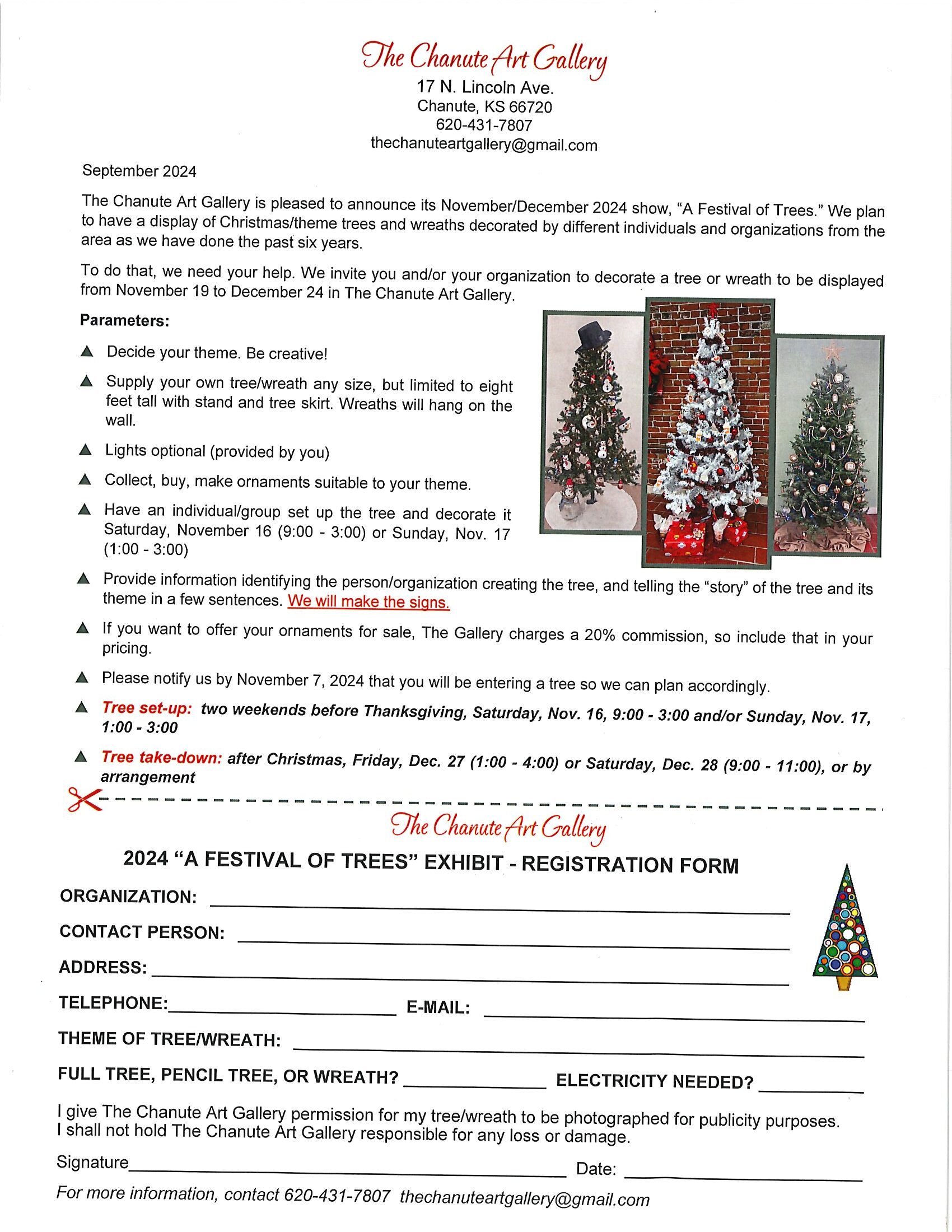 We invite you or your organization to decorate a tree or wreath to be displayed from Nov. 19 to Dec. 24 in The Chanute Art Gallery.