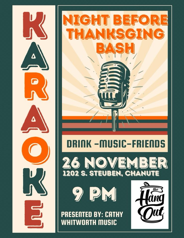 The Hang Out is hosting KARAOKE NIGHT – THE NIGHT BEFORE THANKSGIVING!  Wednesday, Nov. 26th——Starts @ 9PM