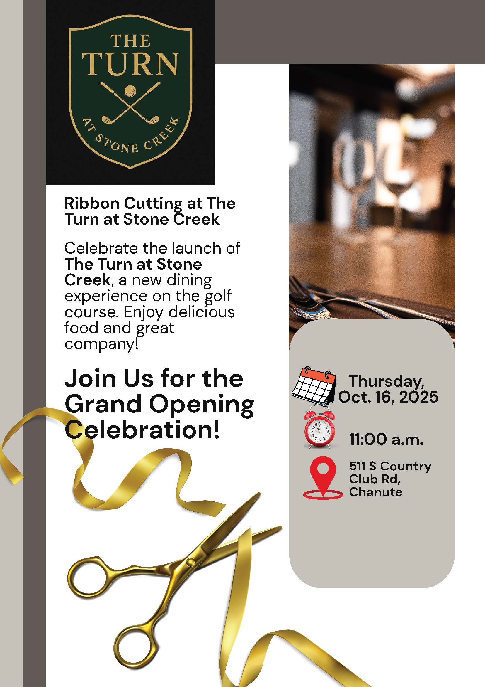 The Turn at Stone Creek Ribbon Cutting – Celebrate the launch of a new dining experience on the golf course. Thursday, Oct. 16; 11:00 a.m.