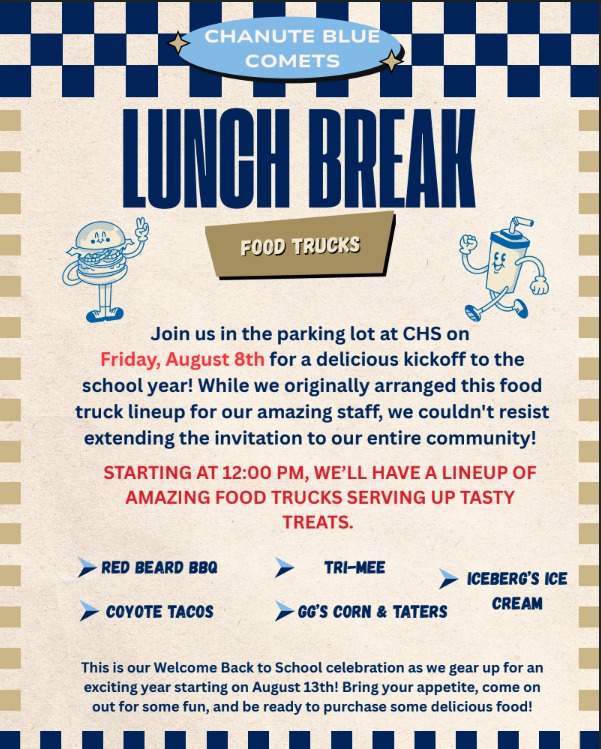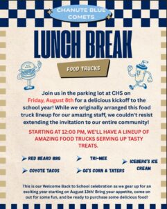 This Friday August 8 – CHS parking lot is the place to be! Join us at 12:00 PM to enjoy delicious food from our fantastic food trucks!