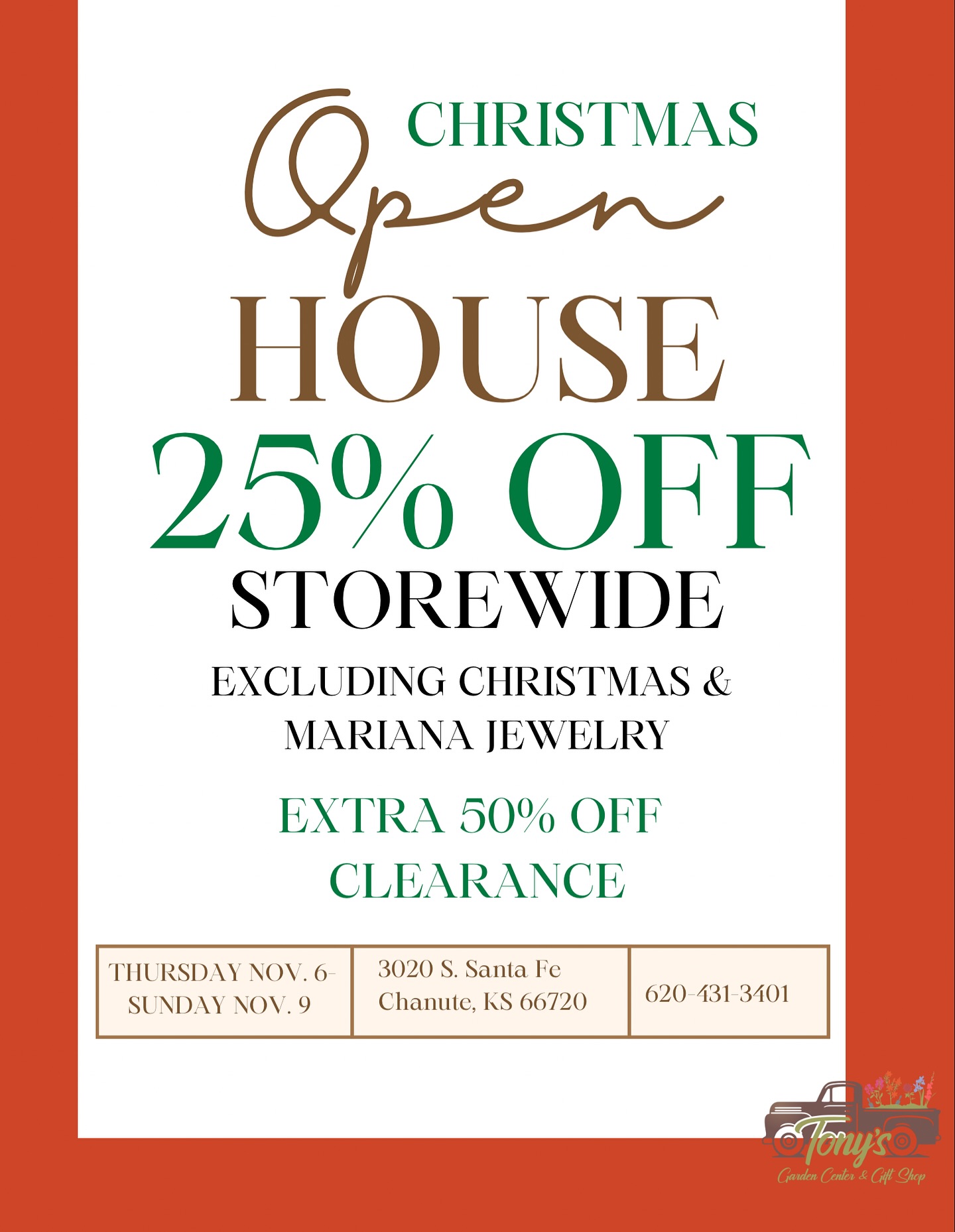 Tony’s Garden Center and Gift Shop – Chanute Kansas will be hosting a Christmas Open House- Nov. 6-9