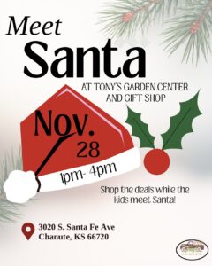 Tony’s Garden Center and Gift Shop – Nov. 28th from 1–4pm; Bring the kiddos, grab a photo, and shop special savings while you’re here!