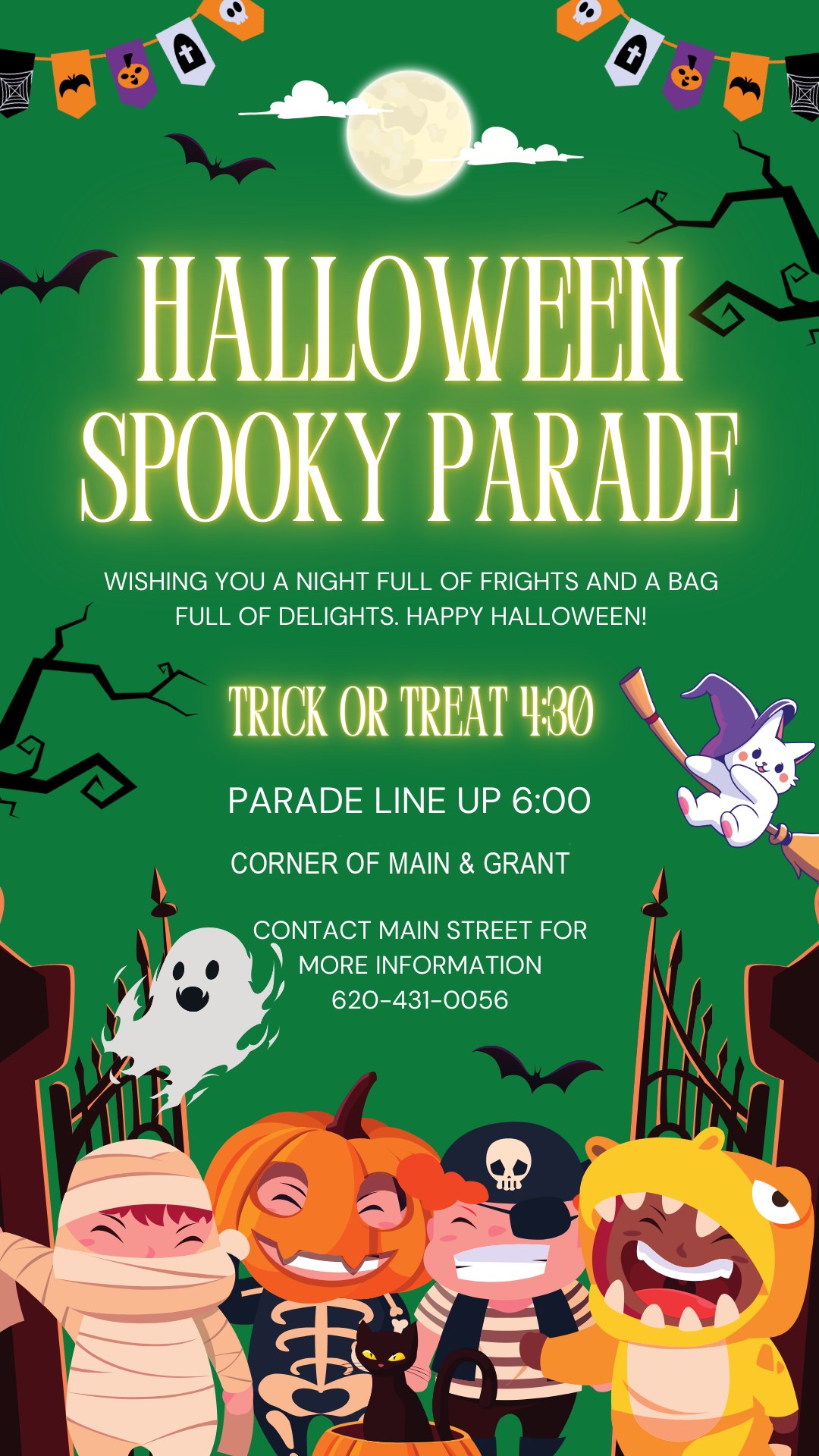 Spook Parade line up will be at 6:00 p.m. after the Trick or Treat event.
