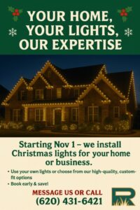 Your Home, Your Lights, Our Expertise*** Starting Nov. 1 – we will install your Christmas lights for your home or business. Roscoes Lawn Care. 620.431.6421