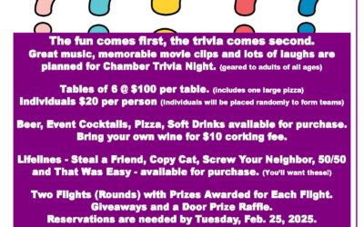 Chamber Trivia Night! Feb. 28, 2026, 6:30 p.m. Central Park Pavilion, Reservations due by Feb. 21, 2026. More details coming soon!